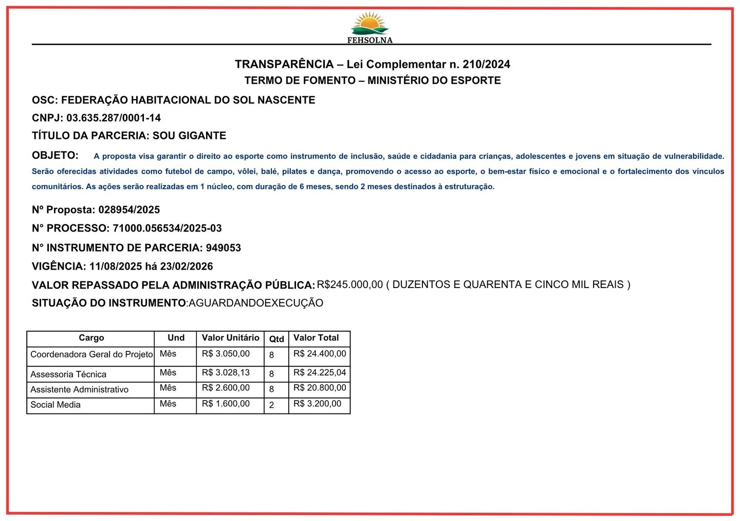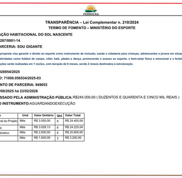 A proposta visa garantir o direito ao esporte como instrumento de inclusão, saúde e cidadania para crianças, adolescentes e jovens em situação de vulnerabilidade. Serão oferecidas atividades como futebol de campo, vôlei, balé, pilates e dança, promovendo o acesso ao esporte, o bem-estar físico e emocional e o fortalecimento dos vínculos comunitários. As ações serão realizadas em 1 núcleo, com duração de 6 meses, sendo 2 meses destinados à estruturação.